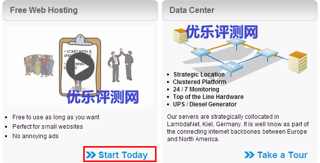 1、打开申请地址:http://www.axohosting.com,下拉首页到“Free Web Hosting”位置,点击“Start Today”进入到主机选择页面。