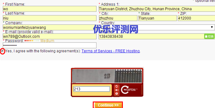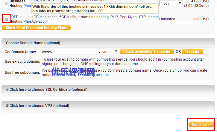 2、勾选“FREE Hosting Plan”套餐,点击“Continue”进入下一步