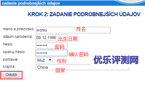 填写详细注册信息,一次是姓名、出生日期、密码、确认密码、性别、国家选项,请一一填写