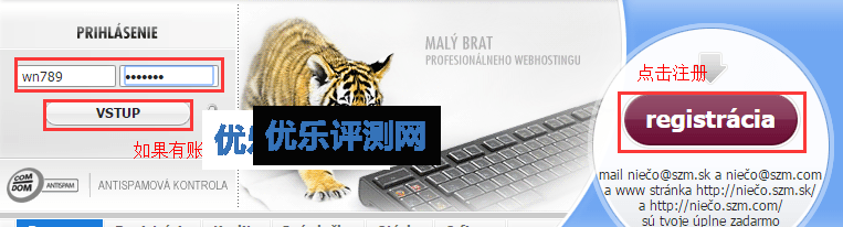 打开申请地址:http://szm.com/freehosting/,如果你有账号可以在“PRIHLASENIE”下填写账号密码登陆,如果需要注册新账号,请点击“registrácia”开始注册。