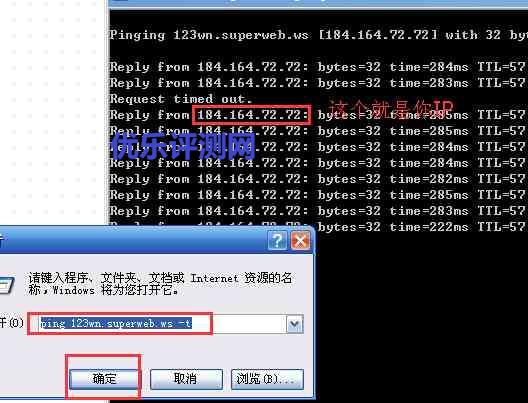 在“运行”窗口对话框内数日“ping 你的二级域名 -t”如图,我输入的是 ping 123wn.superweb.ws -t,然后我们就看到弹出一个窗口,红框位置就是你主机IP了。