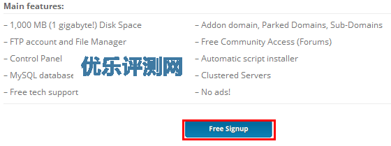 - 2、点击首页的“Free Signup”按钮后进入到一个免费主机介绍页面,我们直接把下拉到如下图位置。点击“Free Signup”继续注册。