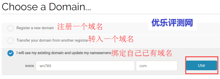3、点击”SIGN UP NOW“后,进入到域名绑定页面,我们最好选择绑定自己现有域名。