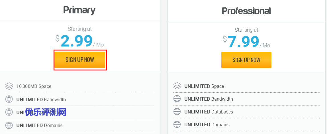 2、我们可以根据自己需要购买的商品,点击进入到购买页面。蜗牛这里以Shared虚拟主机为例,点击”Shared“进入到共享主机页面,我们可以根据自己的情况购买相应套餐。这里蜗牛选择的是”Primary“套餐,10G硬盘,无限流量。