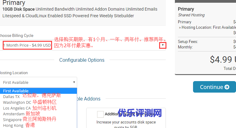 4、选择购买年限和主机服务器地区,如果免费国内用户,建议使用加州洛杉矶和新加坡地区,因为这两处服务器是相当距离中国较近的,访问速度会更快些。选择好年限和主机地区之后,点击”Continue“继续下一步。