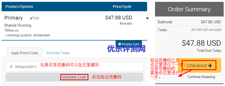 5、确认付款信息,如果你有优惠码可以在这里使用,然后点击”Checkout“进行下一步。