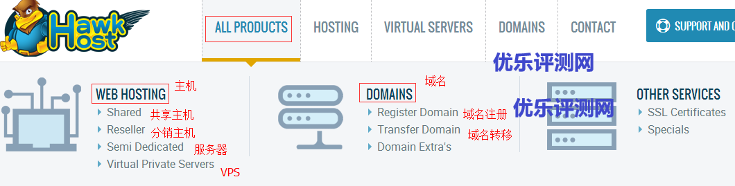 1、打开官网地址。鼠标移动到”ALL PRODUCTS“。我们可以查看到主机和域名注册两大块,如下图: