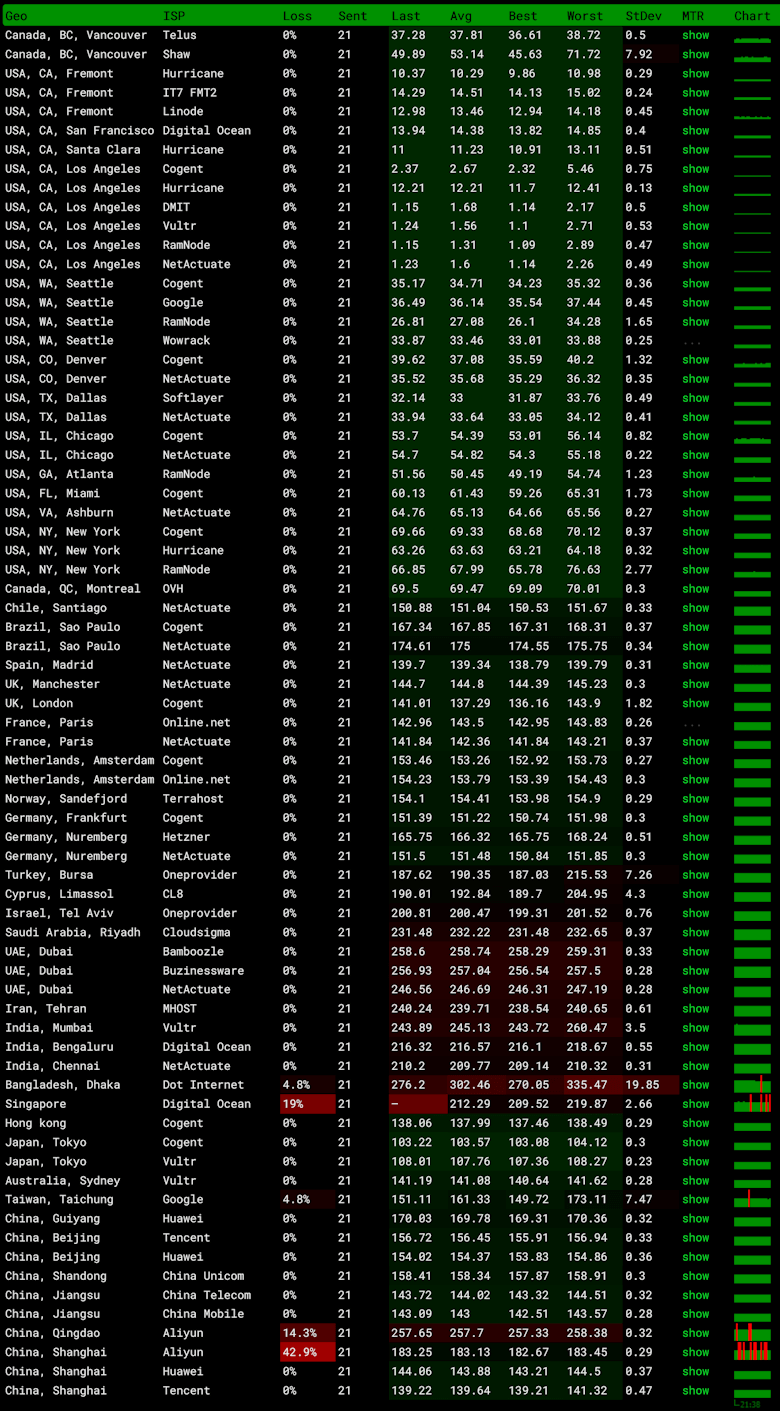 我们可以看到洛杉矶海外线路的稳定性丢包率还是比较好的。亚洲的稍微有几个丢包。
