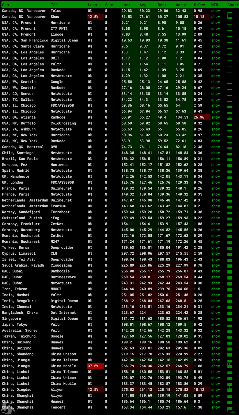 全球节点PING测试和下载上传测速,可以看到整体稳定较好。