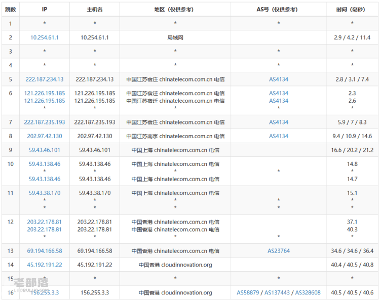 我们可以看到测试IP节点电信走的是CN2优化线路59.43节点,联通和移动也是走的各自优化线路。