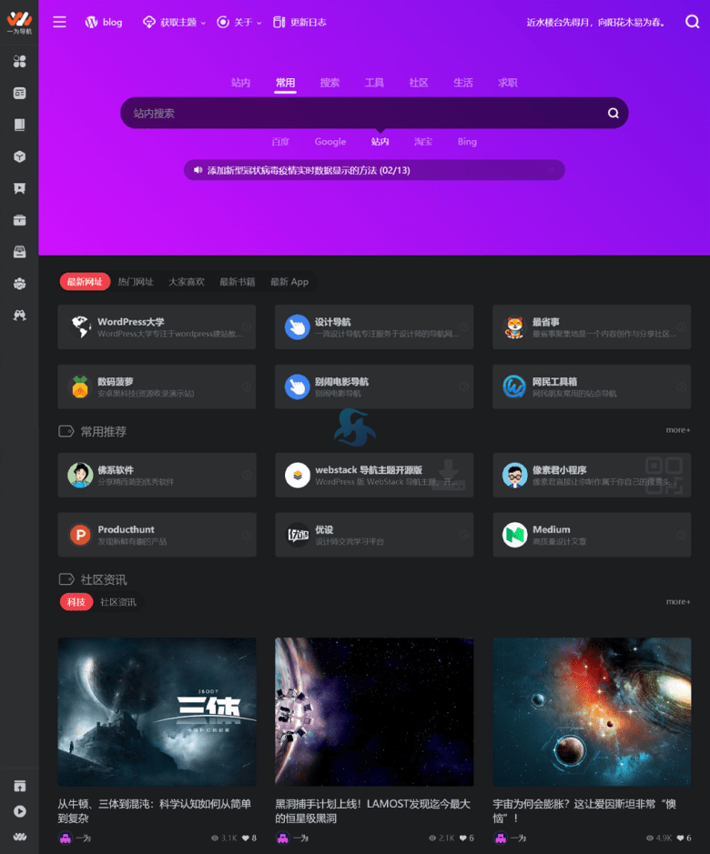 至少在目前全网中,WordPress导航主题中这款 OneNav主题是相对比较完整且多功能的导航目录和内容资源一体的主题。