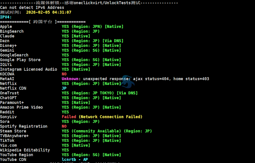这里我们检测看到日本轻量服务器的流媒体兼容情况,是不是基本上都是支持TK、GPT等平台的。