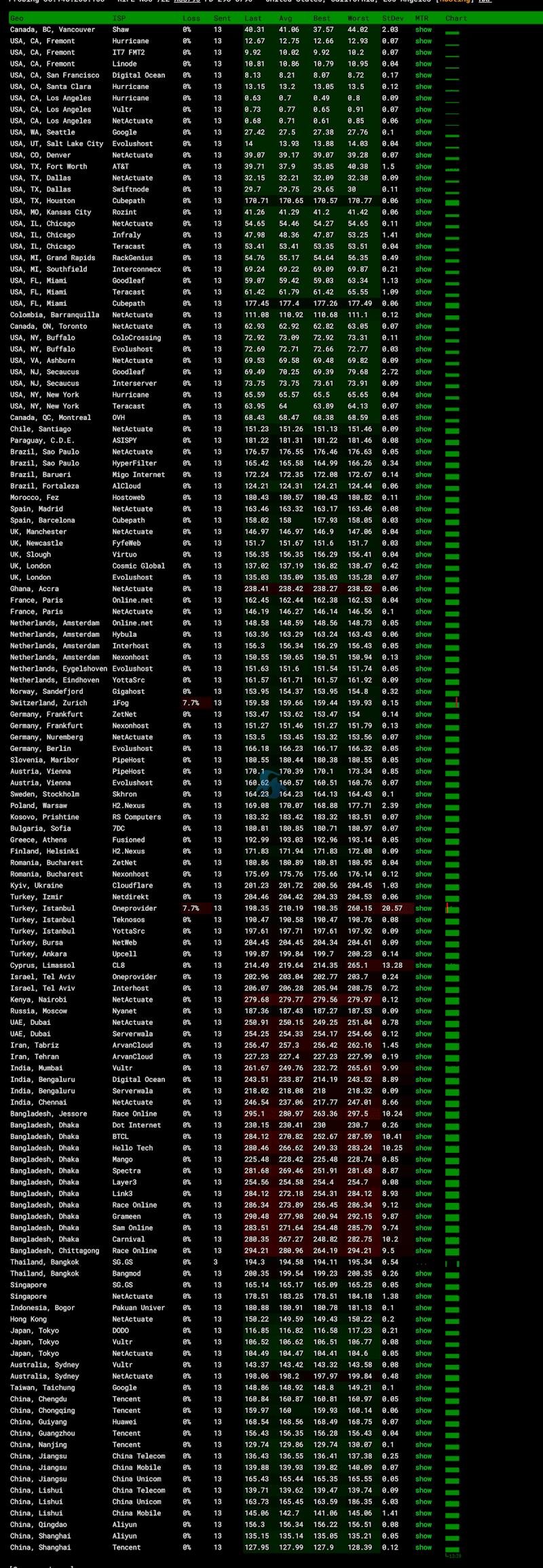 全球随机节点的PING测试可以看到延迟测试稳定性也是很高,也没有丢包。