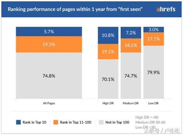 可以看到,这些1年历史的页面,只有5.7%获得了至少一个关键词的前10排名。域名外链越强,这个比例就越高,新页面获得排名的越多。74.8%的1年新页面基本上没有排名。