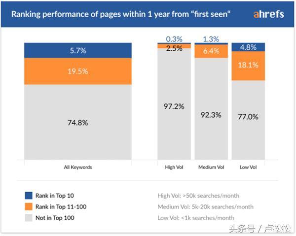 越热门、查询量越高的关键词,新页面获得排名的比例越低。查询量每月5万次以上的热门词,只有0.3%的1年新页面获得了第一页排名。