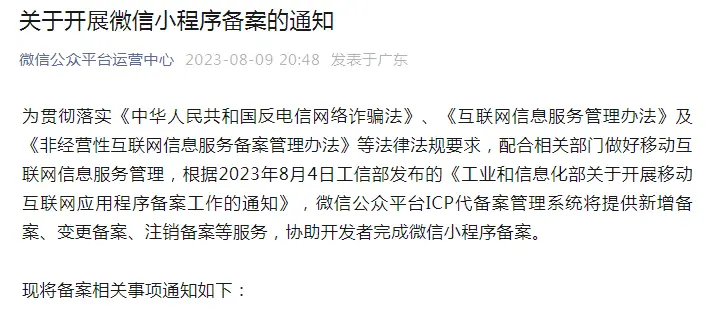 首先来的就是微信公众号,它是跟进政策是最快的了。微信公众号要求所有的微信小程序都要备案。
