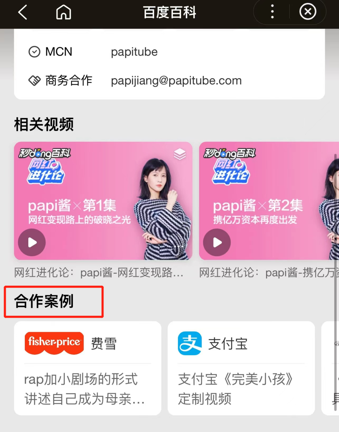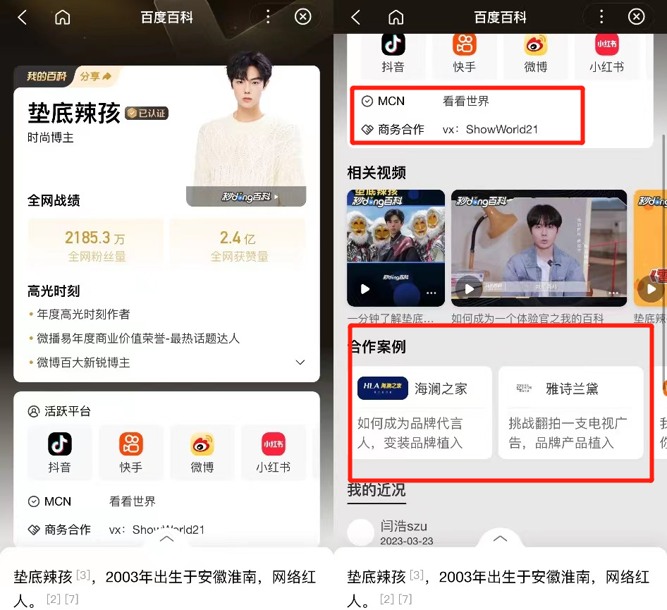比如在百度搜索千万粉变装达人“垫底辣孩”,就能在“我的百科”卡片里直接查看他和海澜之家、雅诗兰黛、小米手机等品牌的合作视频,也能找到其背后的运营机构“看看世界”,建立合作。