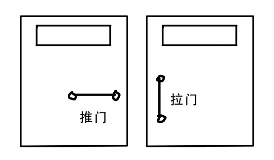 图中两扇门,在开门的方式上存在着不同。由于门把手的放置不同,用户在操作上存在不同方式,左边的门,用户会下意识的去推门,而右边的门用户则会下意识的去拉门,而这一切的引导皆来自用户的心智。