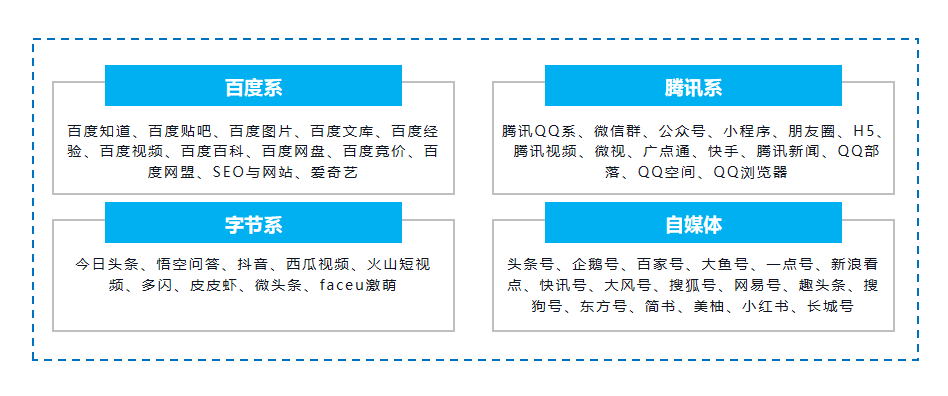 自媒体板块:包括腾讯系、百度系、阿里系、字节系、论坛系、脚本系、裂变系、博客系等。