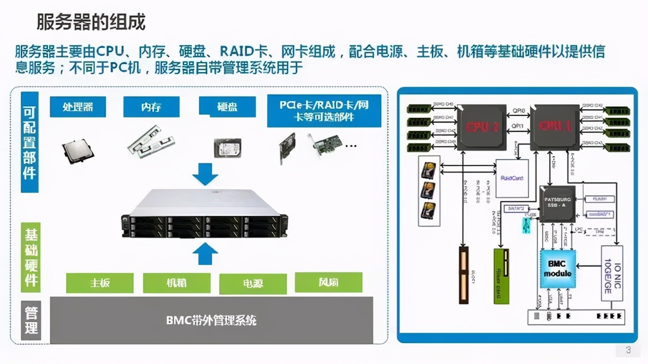 服务器主要由CPU、内存、硬盘、模组、RAID卡组成,配合电源、主板、机箱等基础硬件组成。