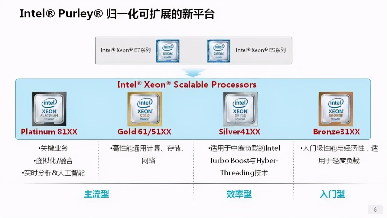 2017年7月,Intel正式发布了代号为Purley的新一代服务器平台,包括代号为Skylake的新一代Xeon CPU,命名为英特尔至强可扩展处理器(Intel Xeon Scalable Processor,SP),也宣告了延续4代的至强E5/E7系列命名方式的终结。