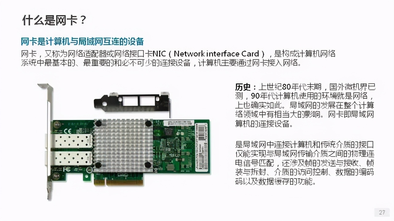 我们再来说说网卡的分类。随着计算机网络技术的飞速发展,为了满足各种环境和层次的应用,出现了不同类型的网卡。