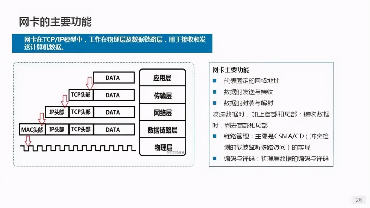 网卡在TCP/IP的模型中,工作在物理层和数据链路层,用来接收和发送数据。除了数据的收发,网卡还有一些其他功能:
