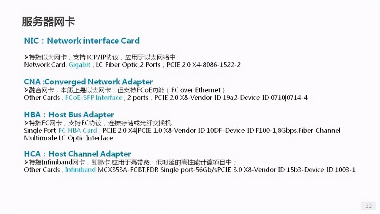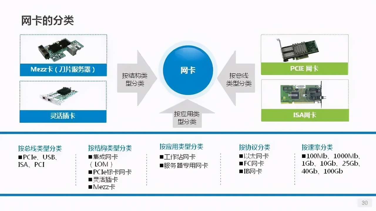 总线分类:PCIe、USB、ISA、PCI,ISA/PCI等总线是比较早期的网络总线,现在已很少用了,USB接口的网卡主要用在消费级电子中。