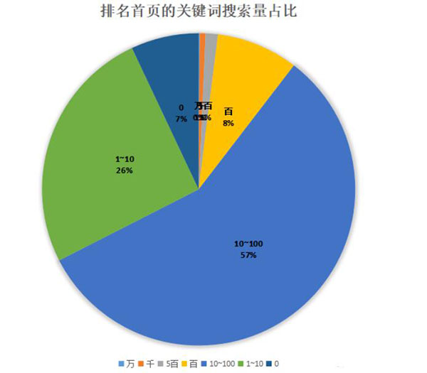 另从我从关键词数据中整理了所有关键词的搜索量情况,并制作了占比图。可以从图中看出,搜索量在10~100之间的词,是主要的获得排名的词。