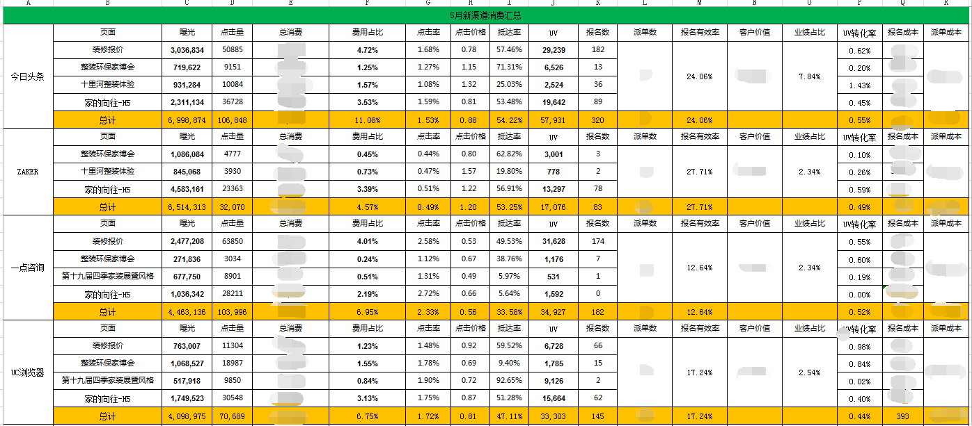 3、各渠道数据对比分析,当投放累计了一定的数据之后,建议广告计划达到1万次点击(8000成本)的点击后,再根据转化效果好的投放计划,查看后台的受众分析,对应调整广告计划的受众人群。
