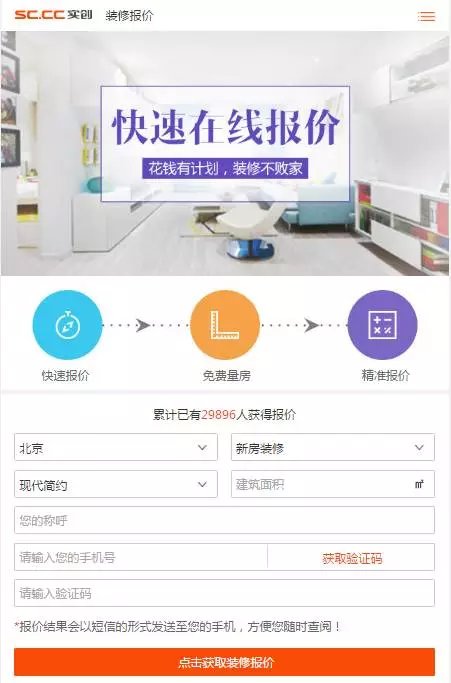 4.页面需准备2版以上,账户上线一同测试,看下图的装修报价的落地页,页面最下方的下载浮层,把下载按钮和最重要的卖点做在浮层上面,无论如何滑动页面,一直都在显著的位置,而且一般用手机,大拇指最容易点到该位置,用户感兴趣可以立即点击跳转下载。