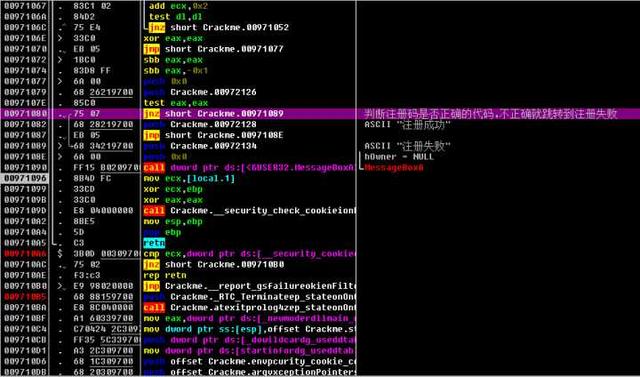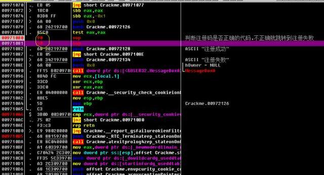 你察觉到这样一个地方判断注册码实在不靠谱,所以,你改变了策略,把检查注册码的代码复制了n遍,或者逐字符检查注册码的准确性,还有人将注册成功等字样进行加密或混淆,等到要用的时候再取出来。