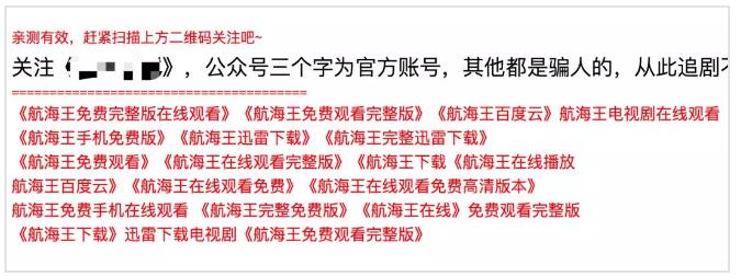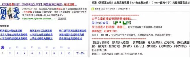比如我想在线看《 海贼王 》动画,百度搜 “ 航海王 免费 在线观看 ”,往往在首页就能遇到给公众号导流的垃圾信息。