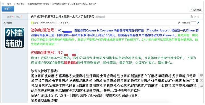 发布、传播含有赌博的信息内容可是要罚款和追究刑事责任的,发广告也得讲法啊。外挂软件的帖子,画风一般是这样的,同样,这些内容也有法律风险。