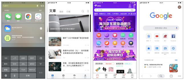 我们看看iOS系统、产品经理APP、淘宝、Google的搜索位置和设计(如下图),从左到右依次是手机系统->阅读类APP->电商类APP->搜索引擎的代表,用户在这些场景里对搜索的需求依次增强,搜索在页面上的表现形式也依次增强:搜索半隐藏->搜索icon->搜索在顶部栏固定->索索是首页主体。