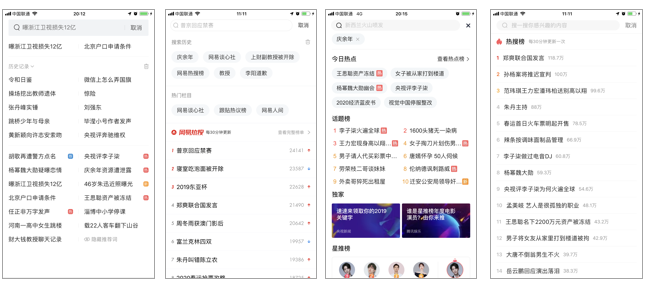 搜索历史记录下常配有热门推荐、特色栏目、话题榜等运营模块。在资讯APP中,以热度榜最为常见,以“标题+热度值或热度角标”的方式出现,让用户能快速了解当前的热点从而点击感兴趣的内容进入“消费场景”。