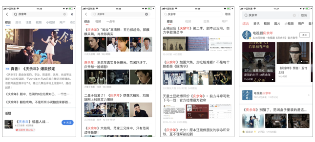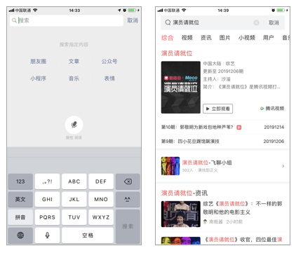 如果内容类型较多,产品会倾向于先让用户限定范围再搜索,使搜索结果更精准,如微信搜索(如下左图),也有的APP是在搜索结果上做分类,如资讯APP(如下右图)。