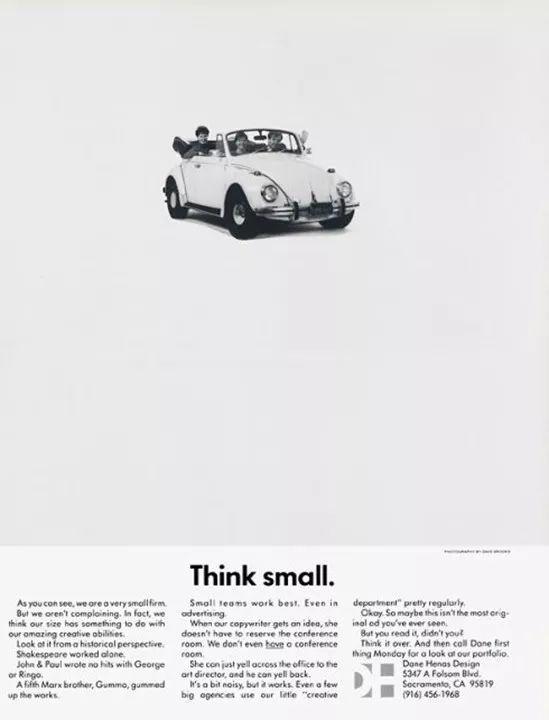 正如当年威廉·伯恩巴克给甲壳虫写的一系列经典广告中,“想想还是小的好”“量入为出”等,一下子让小而精美的车型成为街头热捧对象。