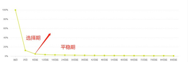 大家可以发现选择期过后的曲线就处于平稳阶段,所以Facebook的10天内逻辑,也是因为10天后属于他们产品的平稳期了,但过了平稳期也意味着大部分的用户已经流失。
