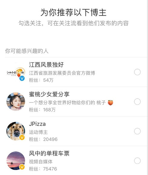 当新用户注册微博时,微博会引导用户进行关注感兴趣的内容博主——博主会每天提供一些有趣、有用的内容,来帮助微博留住新用户。