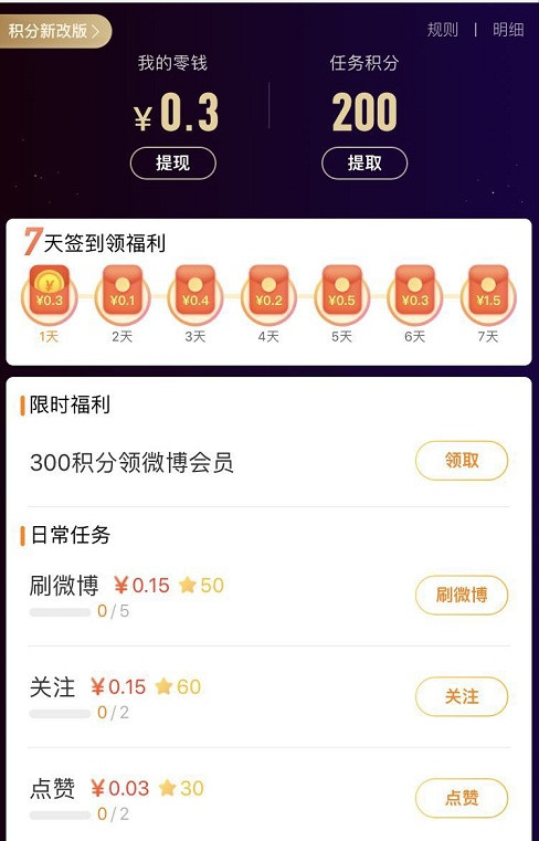 微博把影响用户留存的关键行为,全部安排到每日任务里,通过打造任务体系,以积分/金钱来驱动用户完成产品想要用户完成的动作。