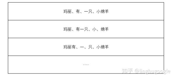 比如:“玛丽、有、一只、小绵羊”每一个词语出现的概率就大于“玛丽、有一、只、小、绵羊”等其他组合出现的概率,那么,我们就认为这个句子就按照“玛丽、有、一只、小绵羊”划分。