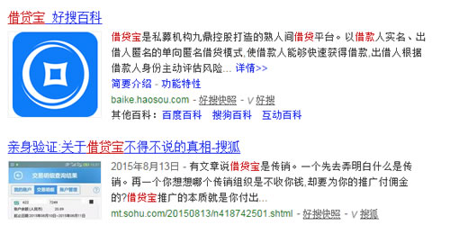 接下来进入正题,我们用好搜和百度搜索”借贷宝”。可以看到同一个网页,一个排名第2,一个排名第4。