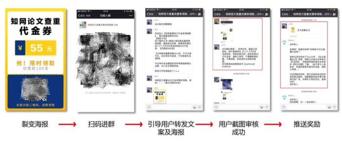 具体流程:用户被吸引进群——转发海报——在群内发截图——审核通过即可得到产品。