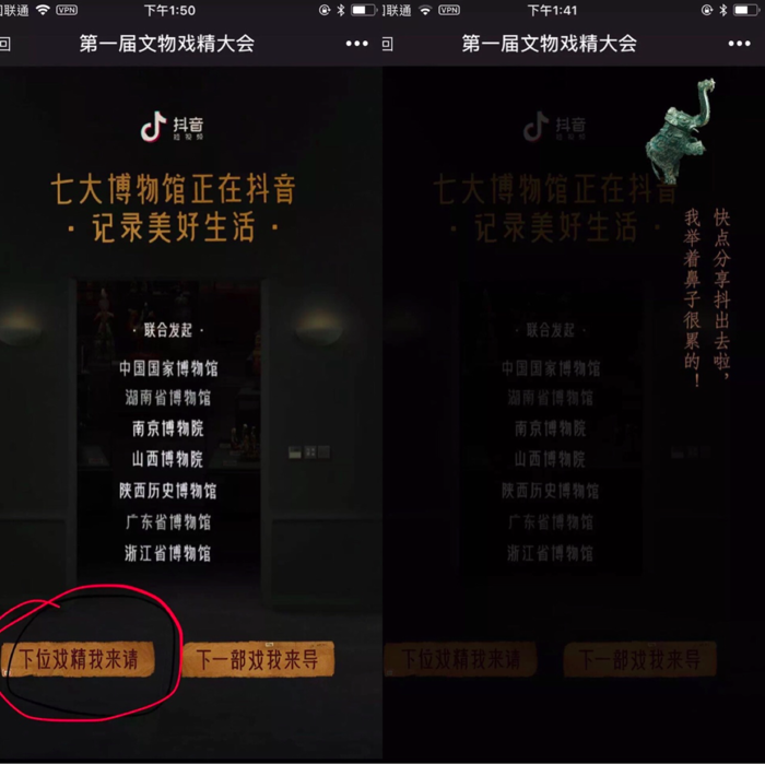 再一个就是H5,这个不是微信自带的形式,但可以在微信上进行传播,是做裂变非常好的载体,最近用该形式比较出名的是抖音的《第一届文物戏精大会》。