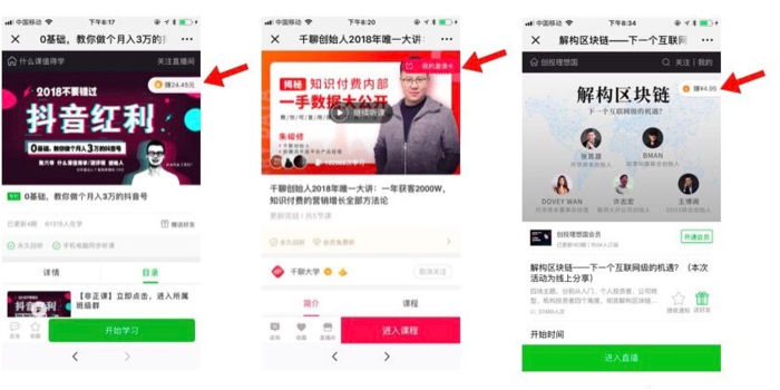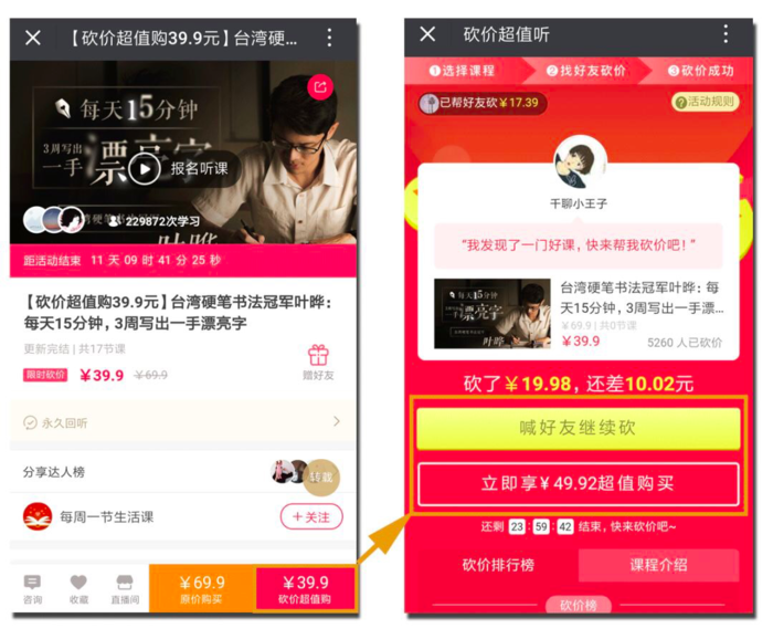 砍价模式是拼多多等电商的标配玩法,营销性质很浓,很少有知识付费产品采用这样的裂变形式,不过,千聊等知识付费平台上线了此功能。