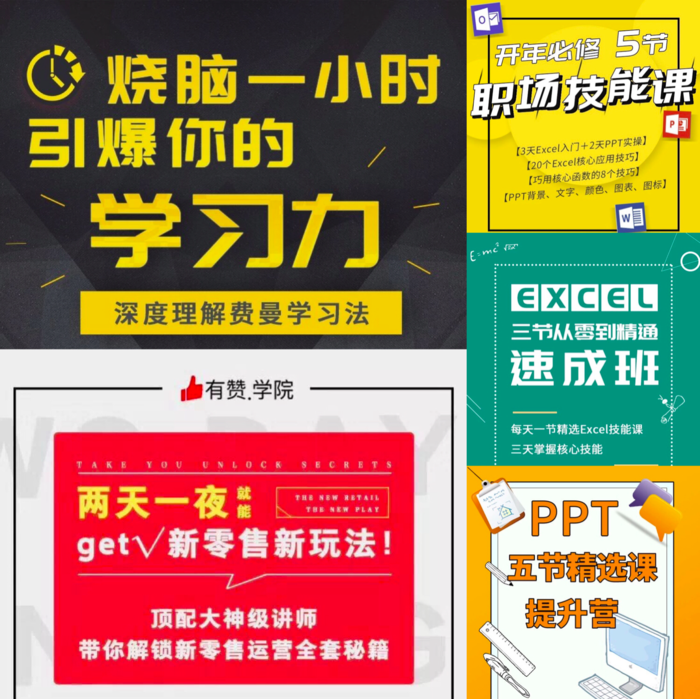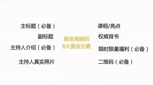 海报其实包含几个大的要素:主文案、产品标题、人物介绍及照片、课程大纲、权威背书、促销信息、二维码。