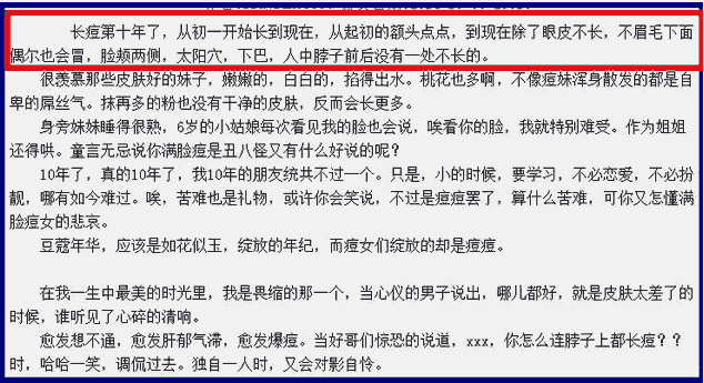 红框的位置中,我们看到,作者是以自己亲身经历来写。长痘十年,描述的很详细。这样的描述,让读者会快速的产生一种共鸣。