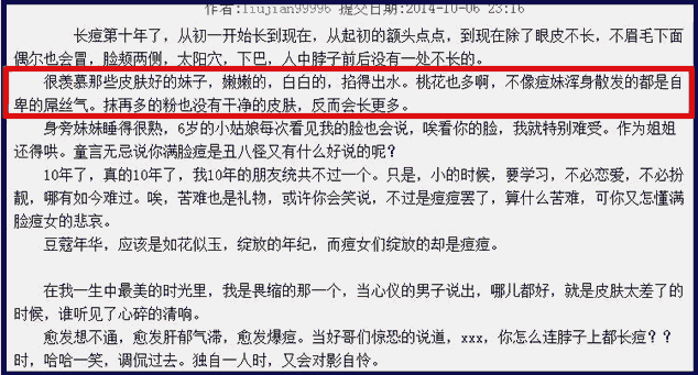 第二段,做出了对比。皮肤好,白嫩的女生桃花多。长痘痘的,自卑,屌丝气,再用化妆品遮掩也没有用,反而让痘痘更加严重。