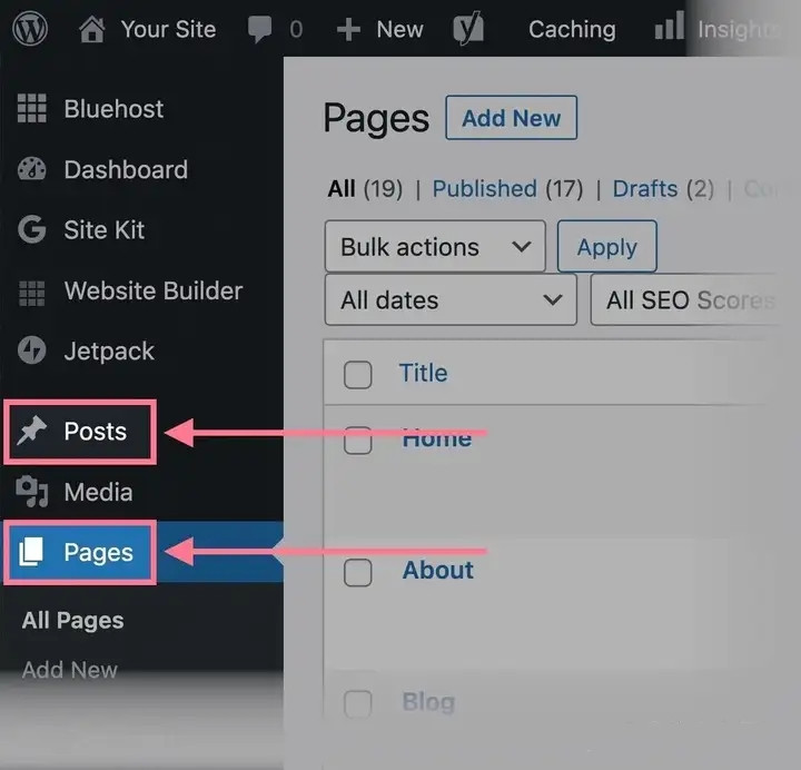要安装 Yoast SEO,请转到 WordPress 仪表板。接下来,单击左侧菜单中的“插件”和“添加新”按钮。